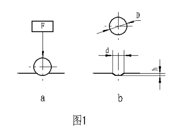 金屬布氏硬度試驗(yàn)系采用一定直徑硬質(zhì)合金球,以規(guī)定試驗(yàn)力壓入被測(cè)材料表面(圖1a)按規(guī)定保持時(shí)間后,卸除試驗(yàn)力,(圖1b)測(cè)量試樣表面的壓痕直徑,以計(jì)算出布氏硬度,并以下式計(jì)算之: