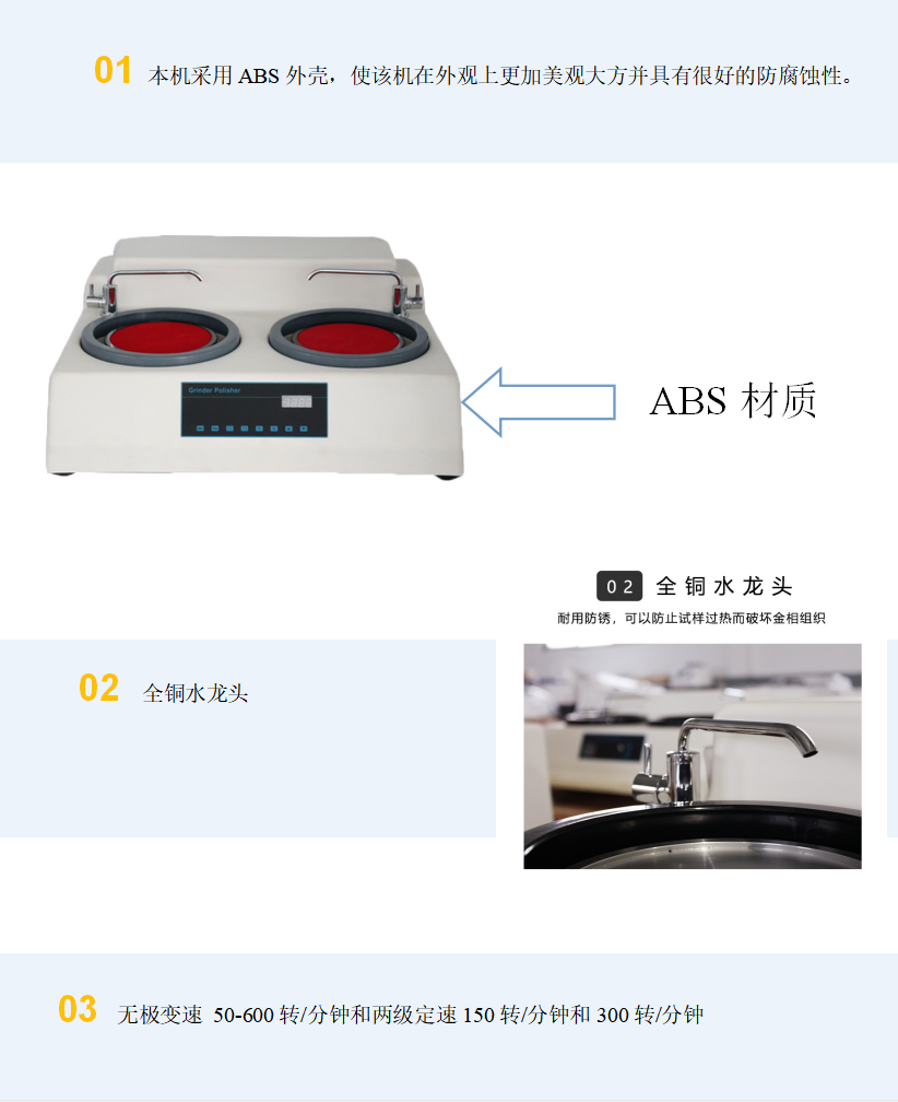 ?磨拋盤轉(zhuǎn)速: 50-600轉(zhuǎn)/分鐘(無級變速) 150轉(zhuǎn)/分鐘和300轉(zhuǎn)/分鐘(兩級定速)
