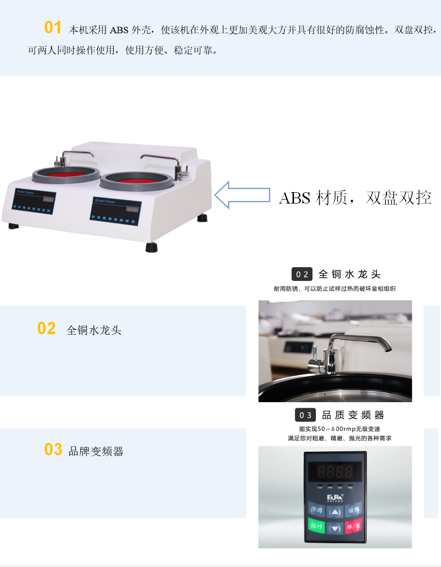 本機(jī)帶有冷卻裝置,可以在研磨拋光時(shí)對(duì)試樣進(jìn)行冷卻,以防止因試樣過(guò)熱而破壞金相組織。該機(jī)使用方便、安全可靠,是工廠、科研單位以及大專院校實(shí)驗(yàn)室的理想制樣設(shè)備。