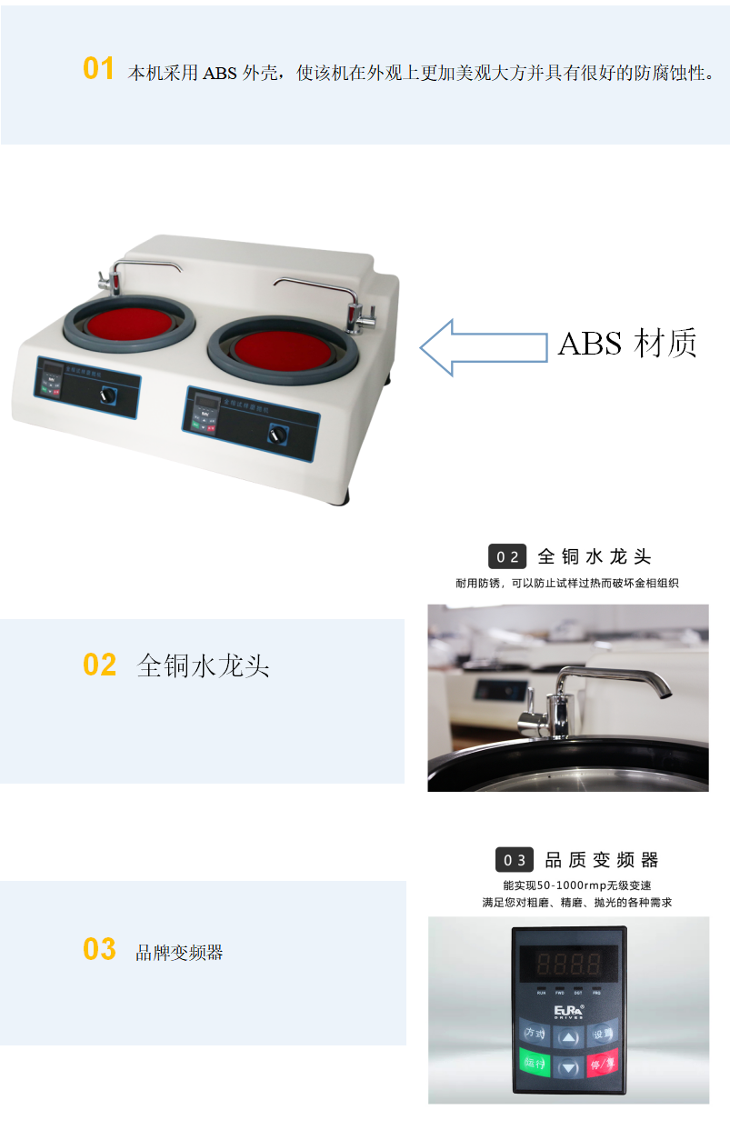本機(jī)通過變頻器調(diào)速,可直接獲得50~1000轉(zhuǎn)/分鐘之間的轉(zhuǎn)速,從而使本機(jī)具有更加廣泛的應(yīng)用性。是用戶用來制作金相試樣必不可少的設(shè)備。